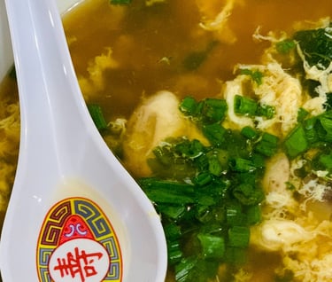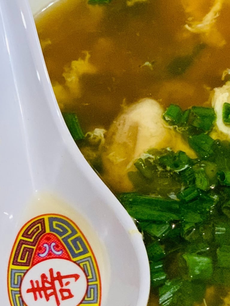 This delicious warm and comforting soup is a classic dish that is both comforting and flavorful. The hints of sesame add a nutty richness to the broth, while the green scallions provide a fresh and slightly sharp taste. The silky strands of egg add a velvety texture to the soup, making it a delight to savor with every spoonful.