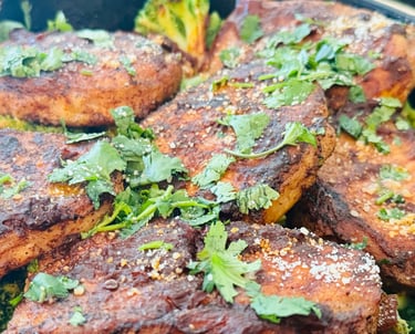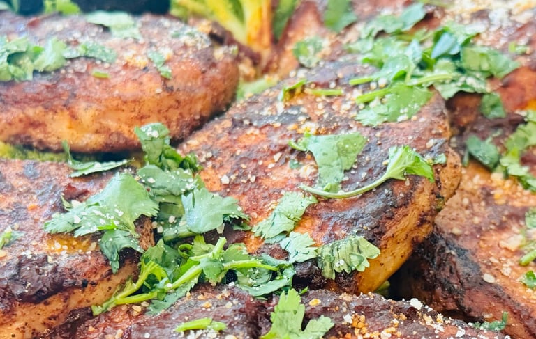 These tender pork ribeyes are seasoned with warm spices of garlic, cumin, and adobo, to maximize flavor in every bite! Served on a bed of adobo spiced broccoli and topped with a generous sprinkle of fresh cilantro leaves, this meal will keep you fueled throughout any busy workday!