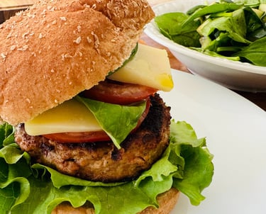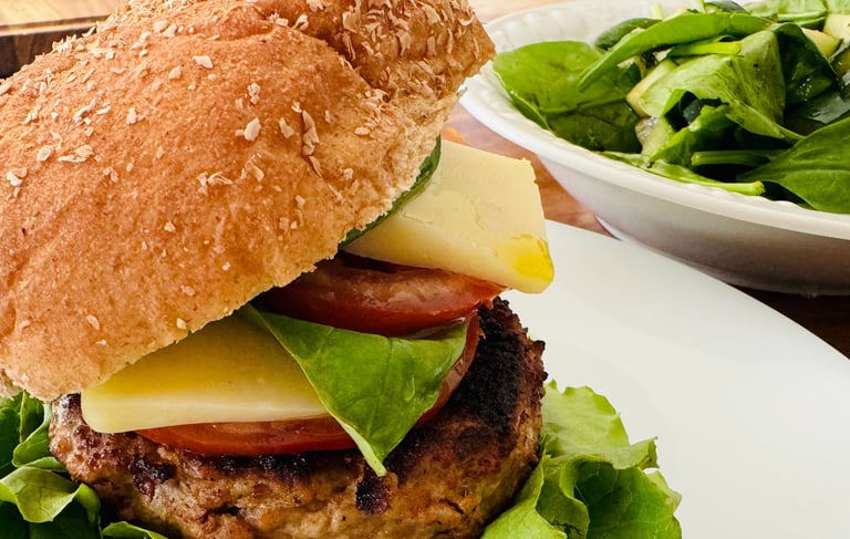 Don't let eating heavy weigh you down, this burger is far from bland and boring! This charred and succulent turkey burger is infused with the additional flavors of garlic and sweet basil, to give it a taste of Capri, Italy. Topped with crisp lettuce, vine ripened tomatoes, mozzarella cheese, and fresh basil, guaranteed to satisfy anyone who loves a delicious caprese salad. Served with a side-salad drizzled with a honey & black balsamic dressing, this Green Goddess salad is packed full of vitamins containing fresh spinach, mint leaves, and English cucumbers.