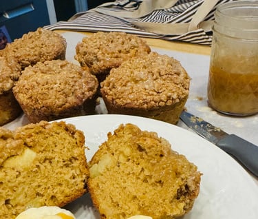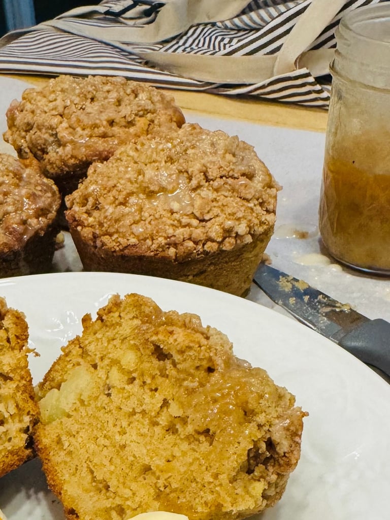 How about a taste of fall during any season of the year? These muffins are studded with chunks of granny smith apples and topped with a crunchy streusel topping, then finished with a generous drizzle of homemade caramel sauce.