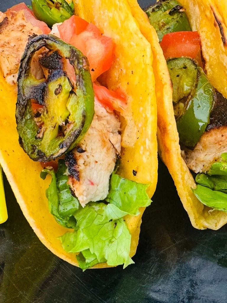 Take your corn tortillas out of the oven and place in your taco holders. Top with shredded lettuce, chicken strips, diced tomatoes, and charred jalapeno slices.