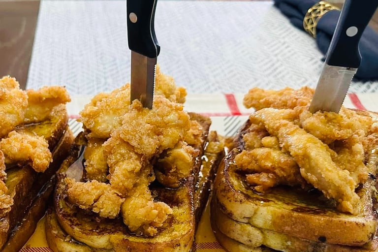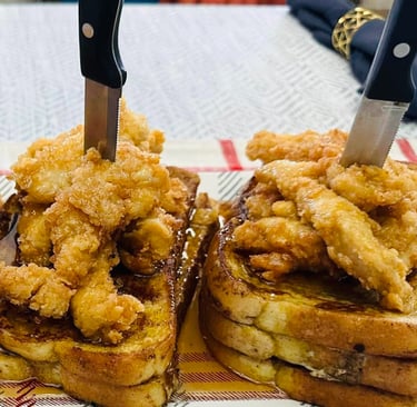 This dish gives a spin on your typical chicken and waffles by incorporating French toast instead. Juicy and deep fried chicken fingers are stacked high on buttery French toast and generously drizzled with maple syrup. You don't have to be a jazz musician to appreciate this meal! A dish you will crave, morning, noon, and night!