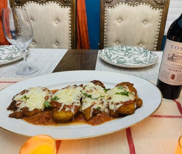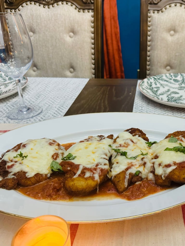 Our classic chicken parmesan celebrates the familiar flavors of this timeless Italian-American favorite that combines tender, breaded chicken breasts with a rich and flavorful tomato sauce and a generous helping of melted mozzarella and Parmesan cheeses, and provolone. The chicken is first pounded out to a thin cutlet, then coated in a seasoned Italian breadcrumb mixture and fried to golden perfection, ensuring a crispy exterior that gives way to succulent, juicy meat.