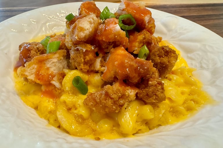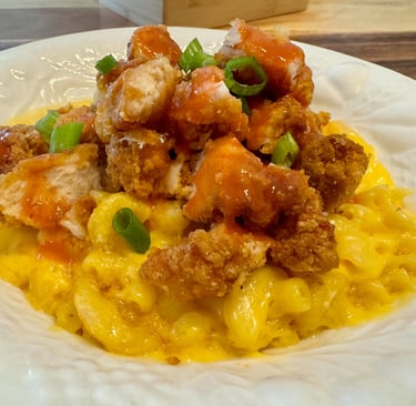 This mac and cheese is great served as a side but we elevated it, with the addition of crispy spicy fried chicken. Turning this mac and cheese into a rockstar entree, this dish has a smooth velvety cheese sauce, that will leave you begging for more! Succulent pieces of spicy fried chicken are topped onto the mac and cheese with a generous drizzle of Franks Red Hot Sauce, while finished with a garnish of green onions. Note: If you prefer a baked mac and cheese option - which I generally prefer, I've included a recipe for this as well. Refer to this at the bottom of the page! Either version goes well with this dish!