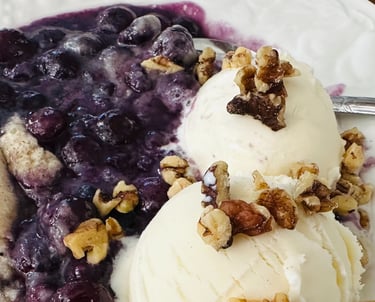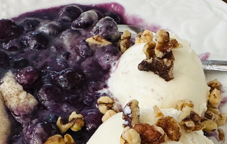 Our Blueberry Cobbler is a delightful symphony of sweet and tart flavors, featuring plump, juicy blueberries that burst with every bite. Nestled under a blanket of soft, golden-brown biscuit type topping, this classic dessert will bring out your inner blueberry fiend. Serve a la mode with chopped walnuts. This dessert pairs best with a glass of Riesling.