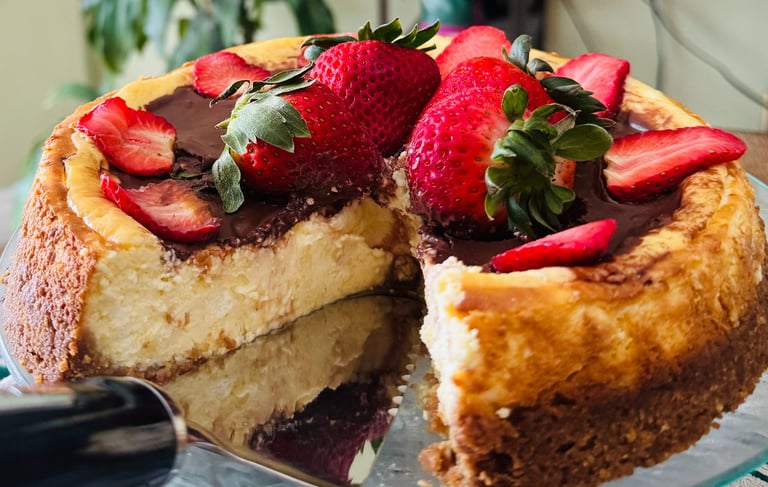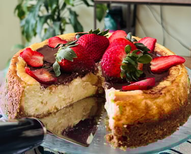 This decadent dessert has a buttery graham cracker crust topped with a smooth cheesecake filling. Finished with a chocolate ganache and sliced strawberries, for the cheesecake lover in your life! This cheesecake pairs nicely with an espresso martini, which highlights the subtle bitter notes of the chocolate.