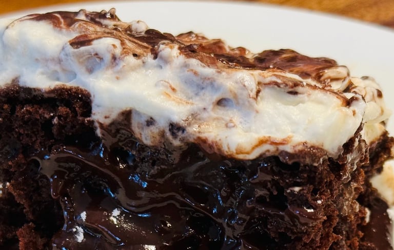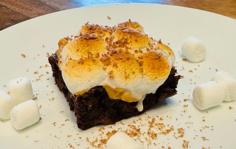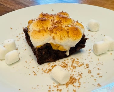 Move over boxed brownies, there is a new sheriff in town and they call her Ms. Peanut Butter Brownie Cloud. These homemade ultra fudgy brownies are loaded with lots of chocolate chips, for a superb taste in each bite. Just when you think we are finished, the brownies are then topped with creamy honey peanut butter and crowned with mini toasted marshmallows. Pair this delectable treat with a cinnamon hot cocoa with a dash of 4 Roses Bourbon for the adults or simply cocoa with a dollop of whipped cream for the youngsters.