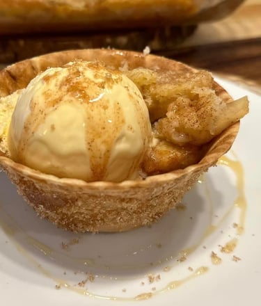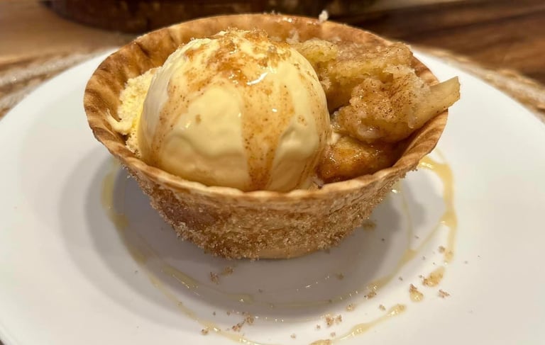 A fan of apple pie are you, well you are about to be star struck! This luscious apple cobbler is placed in a cinnamon sugar waffle bowl and accompanied by his side-kick vanilla bean ice-cream. As a pairing, a tawny port lends nicely with the warm spices of the cobbler.