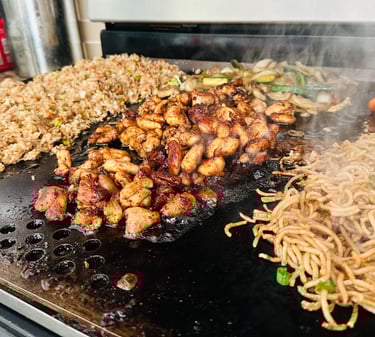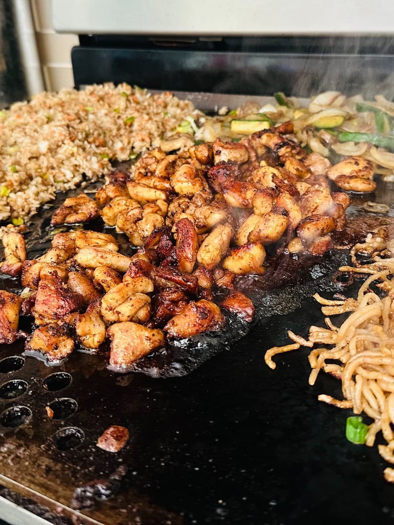 Immerse yourself in the flavors of Japan with our Japanese Teriyaki Chicken, accompanied by a side of fragrant sesame garlic fried rice, mixed vegetables, and soba noodles. The chicken, glazed in a sweet and savory teriyaki sauce, is cooked on a flattop to perfection, offering a succulent texture and a caramelized exterior that’s simply irresistible.
