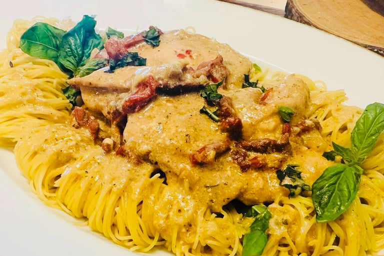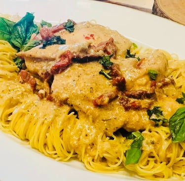 This succulent Tuscan style chicken dish took the internet by storm back in 2022 and continues to do so today. During 2022, it was the 3rd most googled food recipe and it's not hard to understand why! This dish combines everything you love in a pasta dish. Tender pieces of chicken bathed in a silken cream sauce bursting with bright notes of sundried tomatoes, on top of a bed of angel hair pasta.