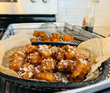 These sugar dusted corn fritters are what you would find at your county fair or even a beloved seafood restaurant. These fritters are great on their own, with seafood, or even at a BBQ. Served with a side of maple syrup, these fritters are dynamite!