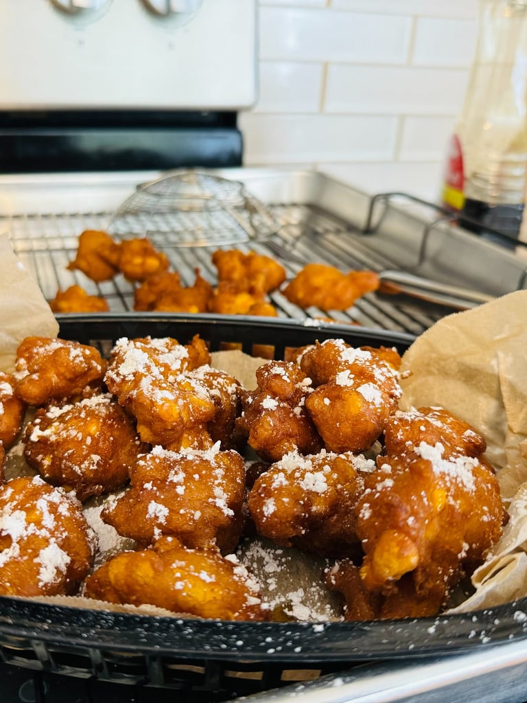 Heat canola oil to 365°. When oil is heated, drop spoonfuls of batter (about 1 1/2 tablespoons each) into the oil and cook, flipping to the other side, until golden brown. This will take 1 1/2 to 2 1/2 minutes.