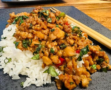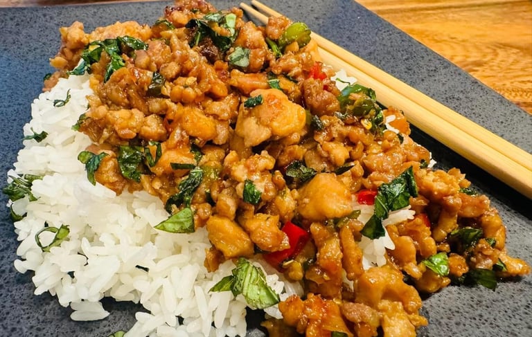 Meet the flavors of the far east with this fresh and delicious meal. Pieces of tender chicken are tossed with fragrant basil and coated in a sweet & savory sauce, over a bed of Jasmin rice. This dish is guaranteed to be a favorite, on your weekly meal rotation.