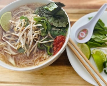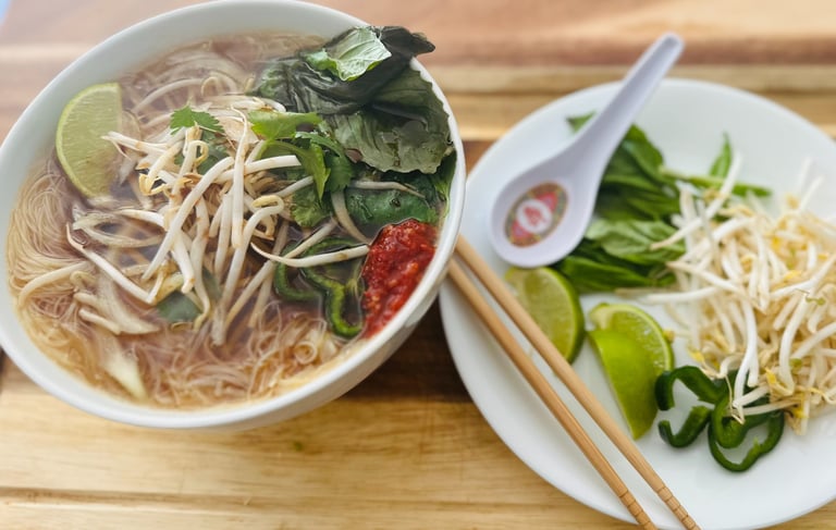 This traditional Vietnamese dish features a flavorful broth simmered with various herbs and spices, perfectly complemented by tender slices of beef. To enhance the taste and add a refreshing touch, fresh basil leaves and lime wedges are added, infusing the soup with their unique fragrance. The soup is garnished with crisp bean sprouts, lending a delightful crunch to each bite and for those who enjoy a bit of heat, sliced jalapenos are sprinkled on top and a dollop of Sambal chili paste.