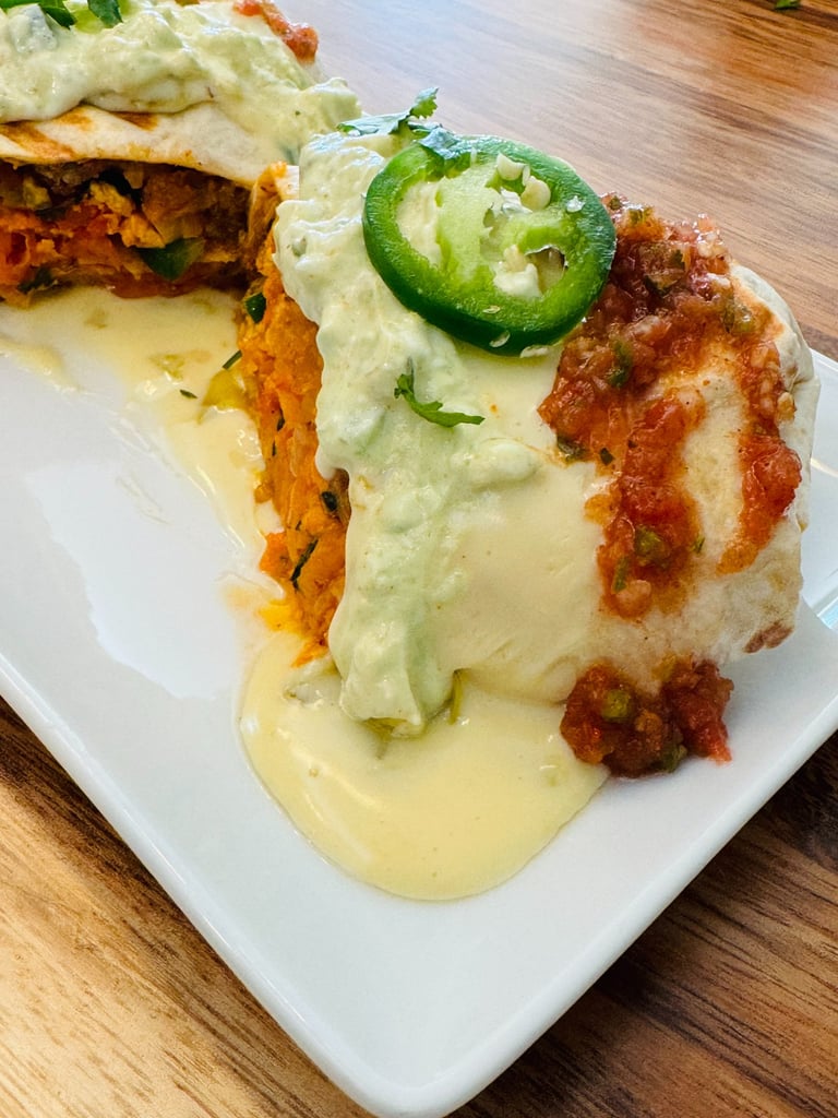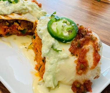 The Chorizo and Sweet Onion Burrito is a savory and satisfying culinary delight that combines the bold, smoky flavors of seasoned chorizo with the sweet, caramelized goodness of Vidalia onions. Wrapped in a warm, soft flour tortilla, this burrito features a hearty filling of spicy chorizo sausage, Mexican rice, buttery scrambled eggs, green bell pepper, and crunchy tortilla chips. Morning, noon, or night, this meal does not disappoint, anytime during the day!