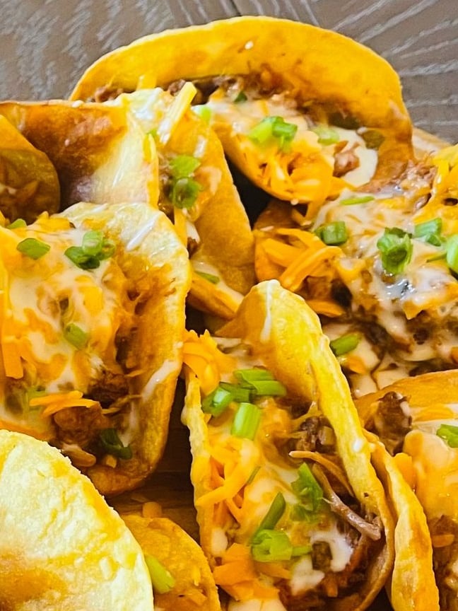 To fried shells, place a potion of the each meat filling into the shell, topping with shredded cheese and chopped green onion.